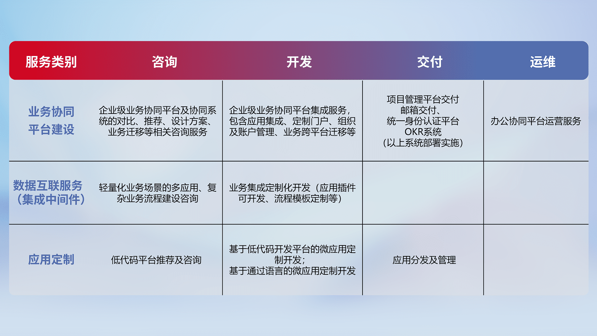 针对钉钉、、企微、、、、IDaas等平台级产品提供产品的规划、、、方案、、交付、、定制化开发等服务,,实现如统一协同办公、、、、智能客户服务、、、、混合会议管理、、、、智能数据查询、、、等业务场景,,,实现数字化转型。。。。